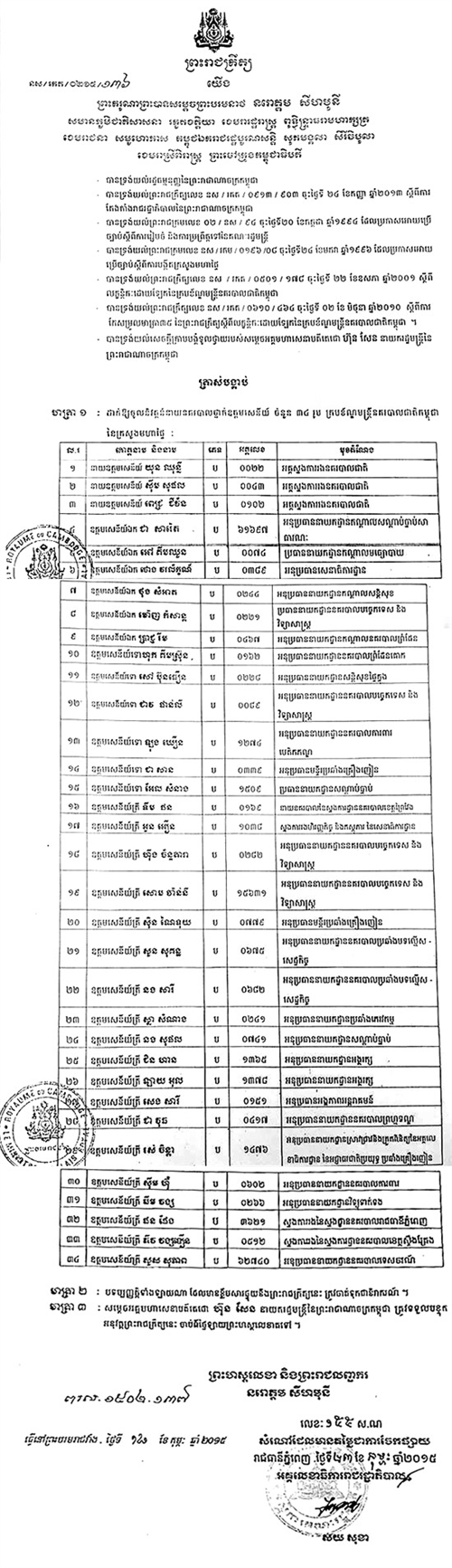 ព្រះរាជក្រឹត្យព្រះមហាក្សត្រ ត្រូវបានរាជរដ្ឋាភិបាលប្រកាសផ្សព្វផ្សាយកាលពីថ្ងៃទី២៣ ខែកុម្ភៈ ឆ្នាំ២០១៥។ សូម អានព្រះរាជក្រឹត្យព្រះមហាក្សត្រ និងឈ្មោះមន្រ្តីនគរបាលទាំង ៣៤រូប ដែលត្រូវបានត្រាស់បង្គាប់ឲ្យចូលនិវត្ត៕