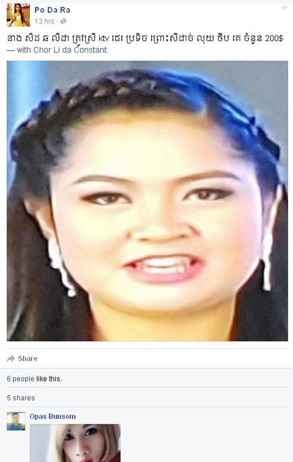 សូមជម្រាបផងដែរថា កាលពីចុងឆ្នាំ២០១៤កន្លងទៅនេះ តារាស្រីទម្រង់មុខមូលសំឡេងស្រទន់ កញ្ញា សិដ្ឋ ឆលីដា ធ្លាប់ត្រូវបានគេជេរ ប្រមាថកាតទាន នាងធ្ងន់ៗ មានភាសាអសុរោះជេរប្រមាថ និងមើលងាយកិត្តិយស នាងមិនសំចៃដៃឡើយ។ នៅក្នុងពេលថ្មីៗនេះ នាងក៏បានពើបប្រទះ នឹងការវាយប្រហារជាថ្មីទៀត ដោយថានាងជាអ្នកកេងចំណេញ លុយនារីខារ៉ាអូខេ ថែមទៀតផង ៕