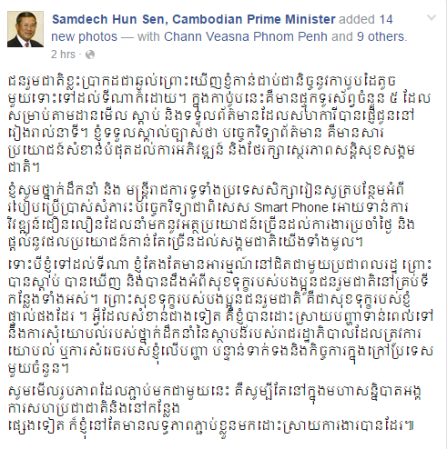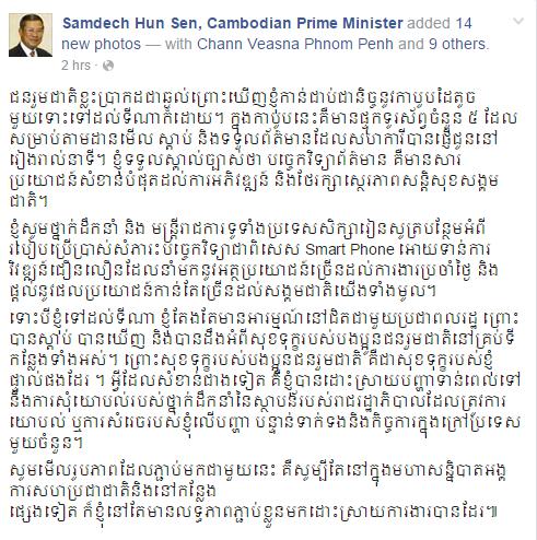 ប្រសាសន៍សម្ដេចតេជោ ហ៊ុន សែន លើទំព័រហ្វេសប៊ុក» ជនរួមជាតិខ្លះប្រាកដជាឆ្ងល់ព្រោះឃើញខ្ញុំកាន់ជាប់ជានិច្ចនូវកាបូបដៃតូចមួយទោះទៅដល់ទីណាក៏ដោយ។ ក្នុងកាបូបនេះគឺមានផ្ទុកទូរស័ព្វចំនួន ៥ ដែលសម្រាប់តាមដានមើល ស្តាប់ និងទទួលព័ត៌មានដែលសហការីបានផ្ញើជូននៅរៀងរាល់នាទី។ ខ្ញុំទទួលស្គាល់ច្បាស់ថា បច្ចេកវិទ្យាព័ត៌មាន គឺមានសារប្រយោជន៍សំខាន់បំផុតដល់ការអភិវឌ្ឍន៍ និងថែរក្សាស្ថេរភាពសន្តិសុខសង្គមជាតិ។