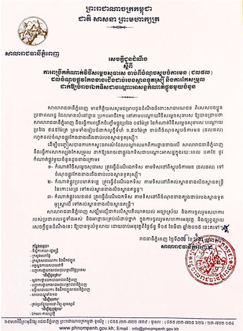 តាមរយៈសេចក្ដីជូនដំណឹងរបស់ខ្លួន សាលារាជធានីភ្នំពេញ សង្ឃឹមថា ប្រជាពលរដ្ឋ និងអាជ្ញាធរគ្រប់លំដាប់ថ្នាក់ ចូលរួមសហការអនុវត្ដនិងផ្សព្វផ្សាយសេចក្ដីជូនដំណឹងនេះ ឱ្យបានទូលំទូលាយ ដោយចាប់អនុវត្ដពីថ្ងៃចន្ទទី៩ ខែមីនា ឆ្នាំ២០១៥នេះតទៅ។