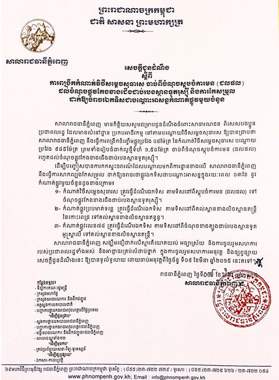 សាលារាជធានីភ្នំពេញ បានសម្រេចដាក់ ឱ្យចរាចរណ៍ជាផ្លូវឯកទិសបណ្ដោះអាសន្ន ក្នុងរយៈពេល៣ខែ លើ កំណាត់ផ្លូវមួយ ចំនួន ដូចខាងក្រោម ទី១ កំណាត់វិថីសម្ដេចសុធារស ត្រូវធ្វើដំណើរឯកទិស តាមទិសដៅពី ស្ដុបចំការមន ឬស្ដុបជលផល ទៅចំណុចផ្លូវកែង ខាងជើងជាប់របងស្ថានទូតរុស្សី ទី២ កំណាត់ផ្លូវប្របមាត់ទន្លេ ត្រូវធ្វើដំណើរឯកទិស តាមទិសដៅពីគល់ស្ពានខាងលិចស្ពានតន្ដ្រីនៃកោះពេជ្រ ទៅគល់ស្ពានខាងលិចស្ពានឥន្ធនូ និងទី៣ កំណាត់ផ្លូវលេខ៧៨ ត្រូវធ្វើដំណើរឯកទិស តាមទិសពីចំណុចខាងត្បូង ជាប់របងស្ថានទូតអូស្ដ្រាលី ទៅគល់ស្ពានខាងលិចស្ពានតន្ដ្រី ។