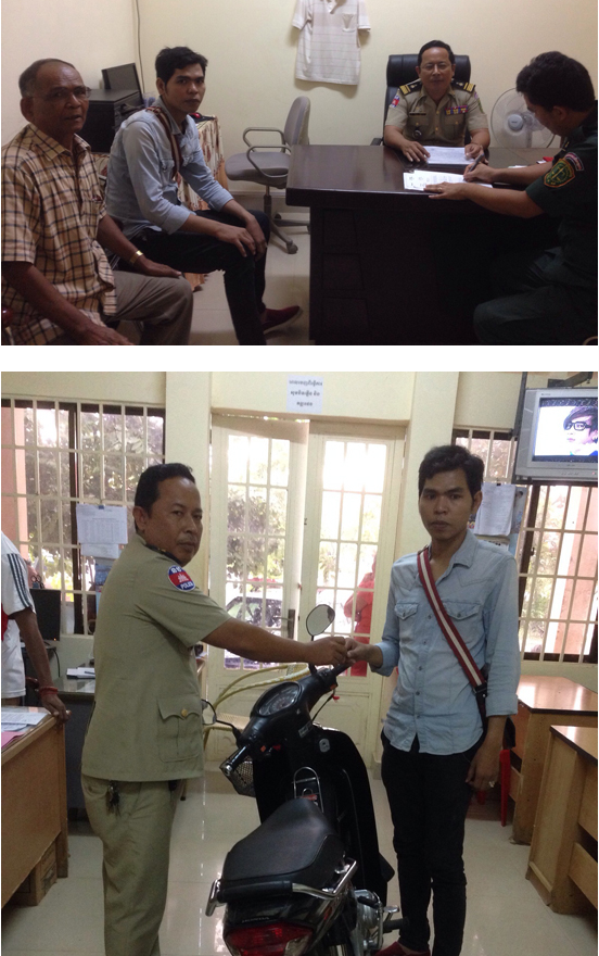 បន្ទាយមានជ័យ ៖ កម្លាំងនគរបាល ខេត្តបន្ទាយមានជ័យ បានស្រាវជ្រាវ និងធ្វើការសហការ ជាមួយ និងនគរបាល ខេត្តសៀមរាប បានតាមប្រមាញ់ រកម៉ូតូ១គ្រឿង បន្ទាប់ពីក្រុម ជនសង្ស័យ លួចយកពីក្រុងប៉ោយប៉ែត កាលពីថ្ងៃទី១៤ ខែកក្កដា ឆ្នាំ២០១៥ កន្លងមកនេះ។