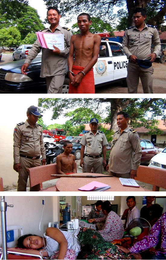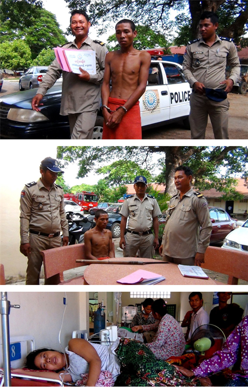ក្រោយកើតហេតុ ប្រជាពលរដ្ឋបានរាយការណ៏ថា មានអំពើហឹង្សាក្នុងគ្រួសារមួយ គឺស្ត្រីកូនខ្ចី ត្រូវបានបុរសជាប្តីវាយដំ និងច្របាច់ក បណ្តាលអោយសន្លប់ ពេលនោះសមត្ថកិច្ច ប៉ុស្តិ៍រដ្ឋបាលមូលដ្ឋាន និងស្រុកចុះទៅដល់កន្លែងកើតហេតុ បានឃើញប្រពន្ធសន្លប់នៅលើគ្រែ ក៏បានអោយម្តាយ ក្មេកស្ត្រីរងគ្រោះ នាំស្ត្រីរងគ្រោះទៅកាន់មណ្ឌលសុខភាពស្រុកកំពង់ត្រឡាច តែដោយរបួស ធ្ងន់ធ្ងរទើបគ្រូពេទ្យ បានបញ្ជូនមកសង្គ្រោះនៅមន្ទីរពេទ្យខេត្ត។ ចំណែកបុរសជាប្តីបាន សម្ងំពពួន នៅលើផ្ទះមិនព្រមចុះ ហើយបានកាន់កាំបិតផ្គាក់ មួយយ៉ាងធំមកជាមួយផង ធ្វើអោយសមត្ថកិច្ចនគរ បាលផ្អើលដកខ្លួនថយមួយរយៈ ក្រោយមកលោក ក៏បានដើរចូល ទៅនិយាយលួងលោម ទល់មុខជាមួយគេ យ៉ាងយូរហូតដល់បុរសនោះភ្លេចខ្លួន ទើបកម្លាំងសមត្ថកិច្ច ស្ទុះសម្រុកចូលទៅចាប់ខ្លួនបាន និងដកហូតកាំបិតផ្គាក់ទុក។