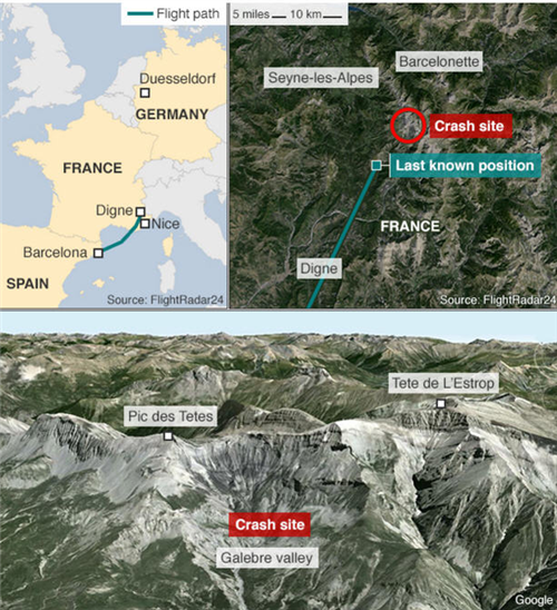 គួរបញ្ជាក់ថា យន្តហោះក្រុមហ៊ុនអាកាសចរណ៍ខាងលើ ប្រភេទ Airbus A320 ផ្ទុក អ្នក ដំណើរសរុប ១៥០ នាក់ ក្នុងនោះ ៦ នាក់ ជាក្រុមការងារបម្រើការលើយន្តហោះ (ក្រុមសហសេវិក) បាន ធ្លាក់ចុះ នៅក្នុងតំបន់ ភ្នំដាច់ស្រយាល ជ្រលងភ្នំ Alps ប្រទេសបារាំង អំឡុងថ្ងៃអង្គារ ម្សិលមិញនេះ ។ យន្តហោះខាងលើ ជាយន្ត ហោះរបស់ក្រុមហ៊ុនអាកាសចរណ៍ Germanwings ដែលមានតម្លៃទាប បានជួប នឹងហេតុការណ៍ ធ្លាក់ចុះ នៅពេលធ្វើដំណើរហោះពីទីក្រុង Barcelona ទៅកាន់ទីក្រុង Dusseldorf ប្រទេស អាល្លឹម៉ង់ ៕