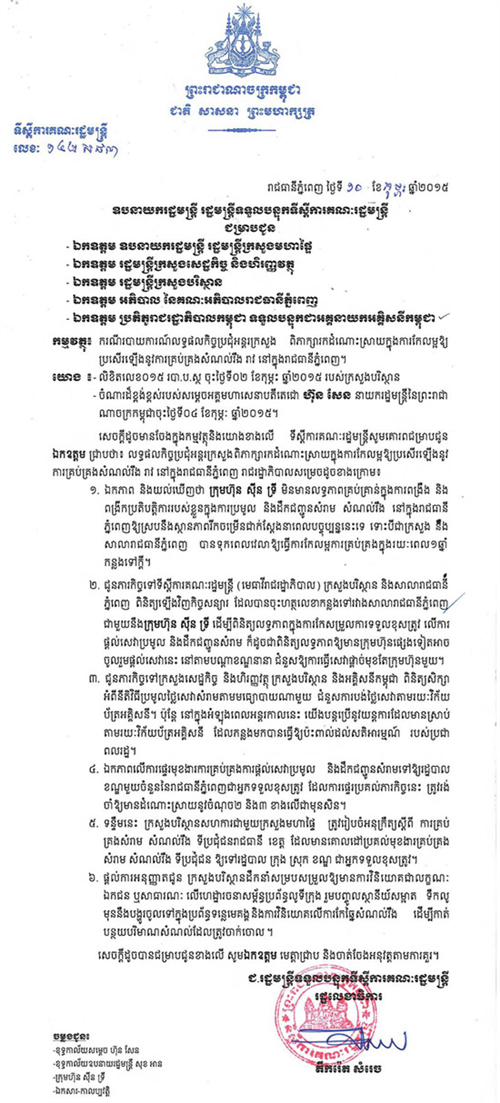 ក្នុងលិខិតរបស់ទីស្តីការគណៈរដ្ឋមន្រ្តី ដែលបានផ្ញើទៅក្រសួងស្ថាប័នពាក់ព័ន្ធ កាលពីម្សិលមិញ បានឱ្យដឹងថា កន្លងមកក្រសួង និងសាលារាជធានីភ្នំពេញ បានទុកឱកាស ឱ្យក្រុមហ៊ុននេះ ធ្វើការកែលម្អ ការគ្រប់គ្រងក្នុង រយៈពេល១ឆ្នាំ ផងដែរ ។