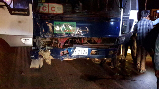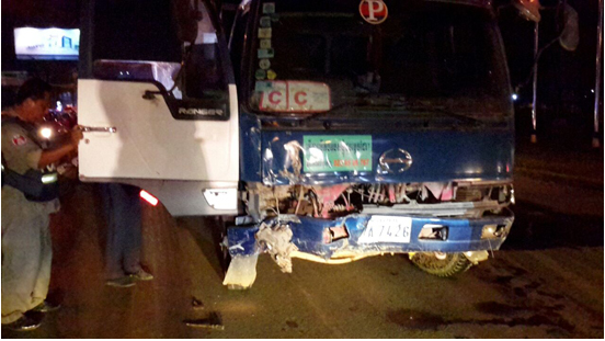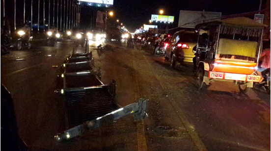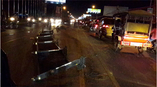 ភ្នំពេញ ៖ របាំងពុះចែកទ្រូងផ្លូវ ចំនួន១០ផ្ទាំង ត្រូវបានដួល និងដាច់ចេញពីគ្នា ដោយសាររថយន្ត ដឹកខ្សាច់ មួយគ្រឿង បើកគេ រថយន្តកូរ៉ូឡាមួយ គ្រឿង ខណៈរថយន្តកូរូឡា ឈប់ឲ្យអ្នកជិះកង់ឆ្លងផ្លូវ កាលពីវេលា ម៉ោង៦និង៥០នាទីល្ងាចថ្ងៃទី១៩ ខែមីនា ឆ្នាំ២០១៥ ស្ថិតនៅតាម បណ្តោយផ្លូវ សហព័ន្ធរុស្សី ភូមិតាងងួន សង្កាត់កាកាប ខណ្ឌពោធិ៍សែនជ័យ ។