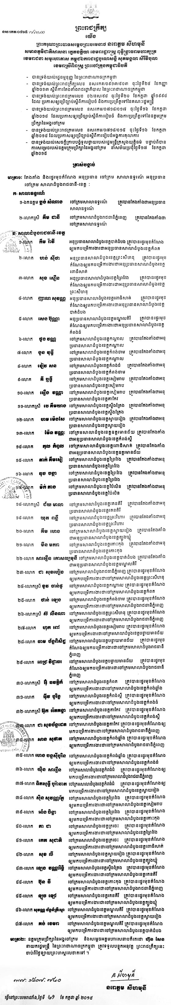 ភ្នំពេញ៖ ព្រះមហាក្សត្រខ្មែរព្រះករុណា ព្រះបាទសម្តេច ព្រះបរមនាថ នរោត្តម សីហមុនី បានចេញព្រះរាជក្រឹត្យត្រាស់បង្គាប់តែងតាំង និង ផ្ទេរមុខតំណែង អនុប្រធាន ចៅក្រម សាលាឧទ្ធរណ៍ និងសាលាដំបូងតាមបណ្តារាជធា នី-ខេត្ត ៤៩រូប។