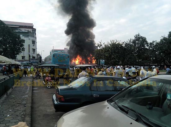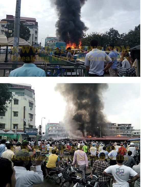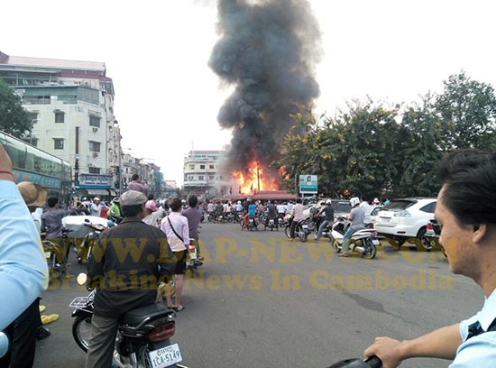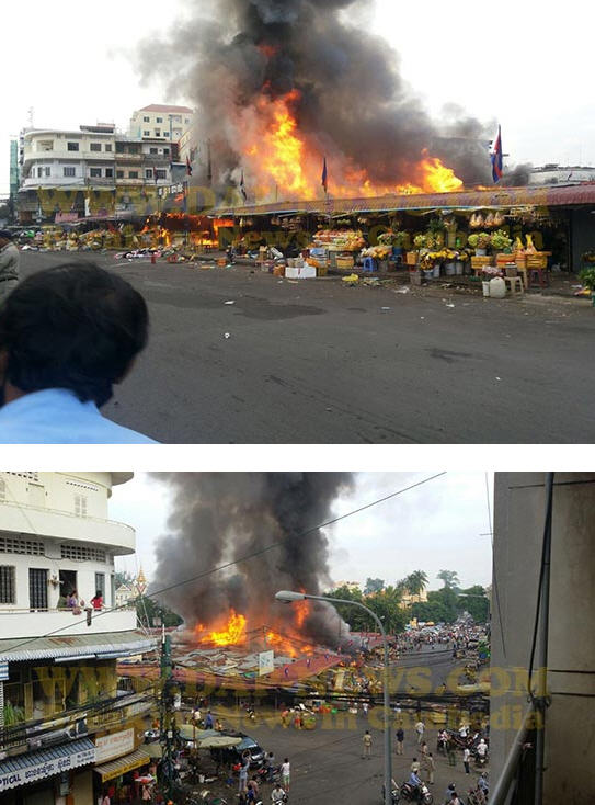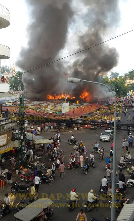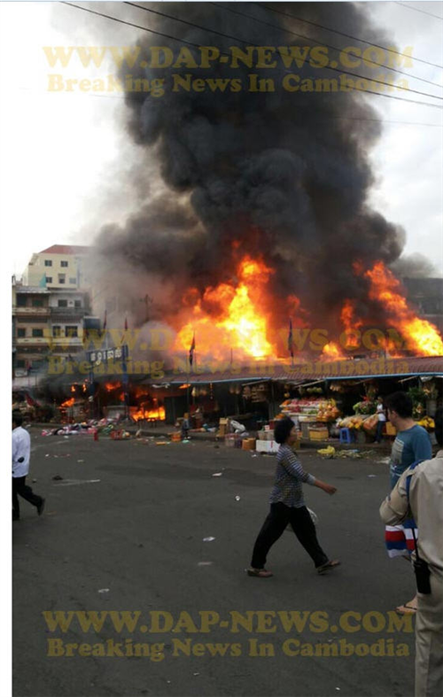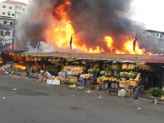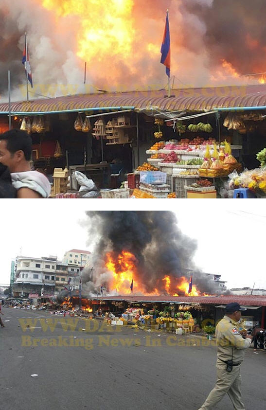 ភ្នំពេញ៖ នៅវេលាម៉ោងប្រមាណ ៧ និង១៥នាទីព្រឹកថ្ងៃចន្ទ ទី២៤ ខែវិច្ឆិកា ឆ្នាំ២០១៤នេះ អគ្គិភ័យបានឆាបឆេះ ផ្សារចាស់ ក្នុងខណ្ឌដូនពេញ យ៉ាងសន្ធោសន្ធៅ។