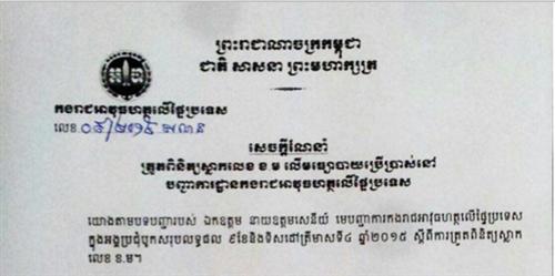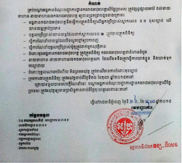 យោងតាមសេចក្ដីណែនាំរបស់លោក ឧត្ដមសេនីយ៍វង្ស ពិសេន បានជូនដំណឹងដល់ នាយទាហាន នាយទាហាន រងកងរាជអាវុធ ហត្ថ ដូចតទៅ ទី១ អង្គភាពកងរាជអាវុធ ហត្ថនិងធ្វើការត្រួតពិនិត្យលើអ្នកប្រើប្រាស់ ស្លាកលេខ ខ.ម ខុសច្បាប់លើយានយន្ដគ្រប់ប្រភេទ ទី២ បុគ្គលប្រើប្រាស់យានយន្ដដែល ពាក់ស្លាកលេខ ខ.ម ត្រូវបានត្រួតពិនិត្យ ទី៣ធ្វើការណែនាំរថយន្ដដែលបិទស្កុតខ្មៅឱ្យបកចេញ ទី៤ ធ្វើការណែនាំបុគ្គលប្រើ ប្រាស់ម៉ូតូ ត្រូវពាក់មួកសុវត្ថិភាព ទី៥ចំពោះ មុខអង្គភាពកងរាជអាវុធហត្ថ ត្រូវត្រួតពិនិត្យ កងរាជអាវុធហត្ថជាជំហានដំបូង ទី៦ នាយ ទាហាននាយទាហានរង កងរាជអាវុធហត្ថ ណា ដែលរឹងទទឹង ត្រូវធ្វើការឃាត់ខ្លួននិង ឃាត់ទុកមធ្យោបាយ ទី៧ ចំពោះបុគ្គលណា អប់រំហើយ មិនព្រមអនុវត្ដ ត្រូវមានវិធាន ការចំពោះមុខច្បាប់ និងទី៨ ក្រុមការងារ ត្រួតពិនិត្យ ត្រូវអនុវត្ដចាប់ពីថ្ងៃទី២៦ ខែ តុលា ឆ្នាំ២០១៥តទៅ ។