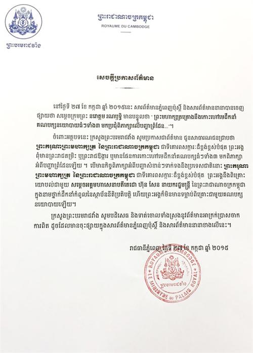 ភ្នំពេញ ៖ នៅព្រឹកថ្ងៃទី២៧ ខែកក្កដា ឆ្នាំ២០១៥នេះ ព្រះបរមរាជវាំង បានចេញ សេចក្ដីប្រកាសព័ត៌មានមួយ ដោយច្រាន ចោលនូវព័ត៌មាន ដែលបានផ្សព្វផ្សាយថា ព្រះមហាក្សត្រ គ្រោងនឹងកោះហៅថ្នាក់ដឹកនាំធំៗ នៃគណបក្សទាំង៣ ដើម្បីទៅពិភាក្សា អំពីបញ្ហាព្រំដែន ។