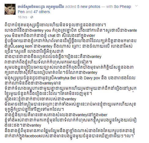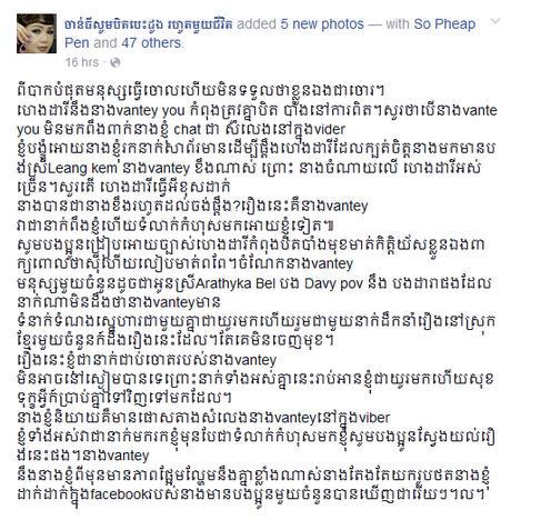 ក្នុងខ្លឹមសារដដែលបន្តថា «សួរថាតើ ហេង ដារី ធ្វើអីខុសដាក់នាង បានជានាងខឹងរហូតដល់ចង់ប្តឹង? រឿងនេះ គឺនាងvantey វាជាអ្នកពឹងខ្ញុំហើយទំលាក់កំហុស មកឲ្យខ្ញុំទៀត។ សូមបងប្អូនជ្រាបឲ្យច្បាស់ ហេង ដារី កំពុងបិទបាំងមុខមាត់ កិត្តិយសខ្លួនឯង ពាក្យពោលថា ស៊ីហើយលាបមាត់ពពែ(ស្វាស៊ីបាយលាបមាត់ពពែ)។ ចំណែកនាង vantey មនុស្សមួយចំនួន ដូចជាអូនស្រីArathyka Bel បង Davy pov និង បងដារាផងដែរ អ្នកណាមិនដឹងថា នាងvanteyមានទំនាក់ទំនងស្នេហា ជាមួយគ្នាជាយូរមកហើយ រួមជាមួយអ្នកដឹកនាំរឿង នៅស្រុកខ្មែរមួយចំនួន ក៏ដឹងរឿងនេះដែរ តែគេមិនចេញមុខ..»។