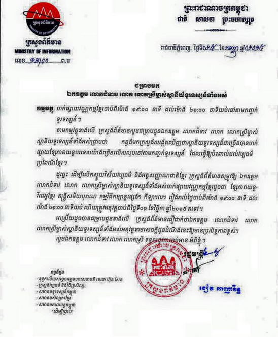 លោករដ្ឋមន្រ្តីបានថ្លែង ប្រាប់ក្រុមអ្នកសារព័ត៌មាន ក្រោយពីបញ្ចប់កិច្ចប្រជុំ ស្តីពីការសម្រេចបង្កើតគណៈកម្មការ សោតទស្សន៍ នៅព្រឹកថ្ងៃទី២៥ កញ្ញានេះថា ដោយសង្កេតឃើញស្ថានីយទូរទស្សន៍ ក្នុងស្រុកភាគច្រើន តែងតែចាក់ ផ្សាយភាពយន្តបរទេស ក្នុងអំឡុងម៉ោង៧-៩យប់ ដែលម៉ោងពេញ និយមជាងគេនៅកម្ពុជា ក្រសួងព័ត៌មានបានចេញ លិខិត ហាមឃាត់ការចាក់ផ្សាយនេះ ជាបន្ទាន់ ហើយ ដើម្បីអនុញ្ញាតឲ្យផ្សាយភាពយន្ត ដែលជាស្នាដៃខ្មែរសុទ្ធសាធ ដើម្បីលើកស្ទួយវប្បធម៌ ជាតិខ្មែរ។
