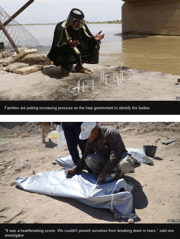 គួរបញ្ជាក់ថា កាលពីអំឡុង ខែ មិថុនា ឆ្នាំ ២០១៤ មានករណី ផ្ទុះ ឡើងនូវ ព័ត៌មាន មិនល្អ បន្ទាប់ពី IS បានបង្ហោះឡើងនូវប្រជុំរូបថត ក៏ដូចជា វីដេអូ ស្តីពីការសម្លាប់ប្រហា រជីវិត ទាហានជាច្រើន ភាគច្រើន មកពី ក្រុម Shia លើបណ្តាញសង្គម ។ យោងតាមសម្តីសាក្សី ដែលមាន ឱកាសរស់រានមានជីវិត ពីការ កាប់សម្លាប់អោយដឹងថា ក្រុម IS បានចោទសួរជនរងគ្រោះ អោយ ចង្អុយបង្ហាញម្នាក់ណា ជាទាហាន Shia មុននឹងសម្លាប់ពួកគេចោល ។