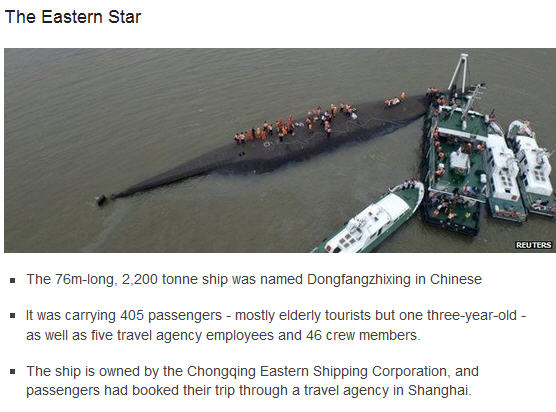សេចក្តីរាយការណ៍ បញ្ជាក់អោយដឹងថា ក្រុមមនុស្សតវ៉ា បាននាំគ្នាវាយកម្ទេចរបាំងការពារប៉ូលីស នៅម្តុំទន្លេ នៃទីតាំងកន្លែងកើតហេតុនាវាលិច ក្នុងខេត្ត Hubei ប្រទេសចិន ដោយ ទាមទារព័ត៌មាន លម្អិតបន្ថែមទៀត ស្តីពីជោគវាសនាអ្នកបាត់ខ្លួន ។ សារព័ត៌មានរដ្ឋចិន អោយ ដឹងថា មនុស្ស ៦៥ នាក់ ត្រូវបានគេរាយការណ៍ថាបានស្លាប់បាត់បង់ជីវិត បន្ទាប់ ពីនាវា Eastern Star ក្រឡាប់លិច បន្ទាប់ពី ជួបគ្រោះអាក្រក់ ព្យុះភ្លៀង នៅរាត្រី ថ្ងៃច័ន្ទ ។