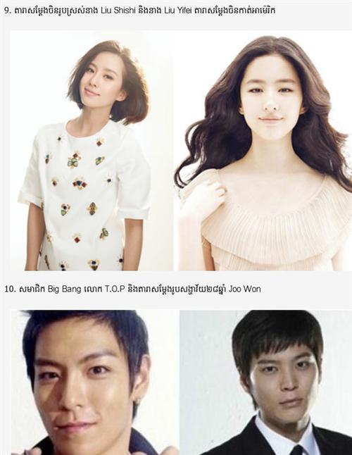 សេអ៊ូល៖ ពិតជាអ្នកគាំទ្រតារាអាស៊ីមែនទេ! បើជាអ្នកគាំទ្រមែន តើអ្នកស្គាល់តារាទាំងនោះច្បាស់ប៉ុណ្ណា? ដោយសារ តែ មុខមាត់របស់ពួកគេ ស្រដៀងគ្នាពេក ។ ថ្ងៃនេះគេហទំព័រកម្សាន្ត យើងខ្ញុំ សូមដកស្រង់រូបភាពពីគេ ហទំព័រ កម្សាន្តកូរ៉េមួយ បង្ហាញឱ្យប្រិយមិត្តដឹងថា តើតារារូបណាខ្លះមានមុខដូចគ្នាធ្វើឱ្យអ្នកច្រឡំ ឬអាចគិតថា ជាកូន ភ្លោះ ។