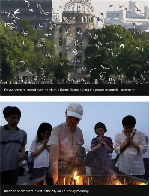 គួរបញ្ជាក់ថា កម្មវិធី ប្រារព្ធខូប ដ៏អធឹកអធម ៧០ ឆ្នាំ ថ្ងៃ ៦ សីហា ២០១៥ នេះ មានការចូលរួម ដោយផ្ទាល់អធិបតីភាពនាយករដ្ឋមន្រ្តីប្រទេស ជប៉ុន Shinzo Abeនៅឯសួនឧទ្យានគោរពវិញ្ញាណ ក្ខ័ន្ធ Hiroshima ខណៈ ក្រោយមក មាន កម្មវិធីបណ្តែតចង្កៀង គោម នៅទន្លេ Motoyasu ក្នុងក្រុង ។ ៦ សីហា ១៩៤៥ អាមេរិក ទម្លាក់ គ្រាប់បែក បរិមាណូ គ្រាប់ដំបូង ខ ណៈ ៣ ថ្ងៃក្រោយមក ពោល ថ្ងៃ ទី ៩ សីហា ១៩៤៥ អាមេរិក ទម្លាក់គ្រាប់បែក បរិមាណូ គ្រាប់ទី ២ ឈានទៅដល់បញ្ចប់ សង្គ្រាម លោកលើកទី ២ បន្ទាប់ពី ជប៉ុន សុំ ចុះចាញ់សង្គ្រាម ក្រោយពីការទម្លាក់គ្រាប់បែក បរិមា ណូទាំង នេះ បានសម្លាប់ ពលរដ្ឋជប៉ុន ហោចណាស់ ១៤០,០០០ នាក់ ក្នុងរយៈពេលត្រឹម តែមួយ ថ្ងៃ។