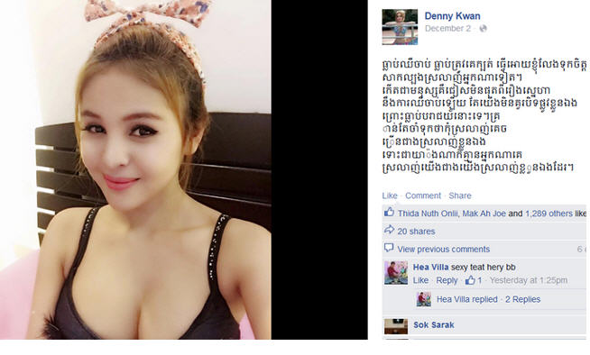 បែរមកនិយាយ ពីរឿងស្នេហារបស់កញ្ញា ដេនី ឯណេះវិញ កន្លងមកពុំធ្លាប់ត្រូវបាននរណាម្នាក់ដឹងទេថា នាងធ្លាប់មានស្នេហា ឬកំពុងសាងសម្ព័នភាពស្នេហ៍ ជាមួយបុរសណាឡើយ។ ប៉ុន្តែស្រាប់តែថ្មីៗនេះ នាងបានសរសេរបង្ហោះ នៅលើហ្វេសប៊ុកជាសាធារណៈ ដូច្នេះថា «ធ្លាប់ឈឺចាប់ ធ្លាប់ត្រូវគេក្បត់ ធ្វើឲ្យខ្ញុំលែងទុកចិត្ត នឹងសាកល្បងស្រឡាញ់អ្នកណាទៀត។ កើតជាមនុស្ស គឺជៀសមិនផុតពីរឿងស្នេហា នឹងការឈឺចាប់ឡើយ តែយើងមិនគួរបិទផ្លូវខ្លួនឯង ព្រោះធ្លាប់បរាជ័យនោះទេ ។ គ្រាន់តែចាំទុកថាកុំស្រលាញ់គេច្រើនជាង ស្រលាញ់ខ្លួនឯង ទោះជាយ៉ាងណា ក៏គ្មានអ្នកណាគេស្រលាញ់យើង ជាងយើងស្រលាញ់ខ្លួនឯងដែរ..»។