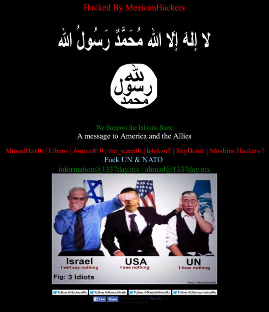 យោងតាមគេហទំព័ររបស់អង្គការសហប្រជាជាតិ បានបង្ហាញពីក្រុមវាយប្រហារនេះ ដាក់រូបមេដឹកនាំ៣នាក់ រួមមាន នាយករដ្ឋមន្ដ្រី អ៊ីស្រាអ៊ែល ប្រធានាធិបតី អាមេរិក និងអគ្គលេខាធិការ អង្គការសហប្រជាជាតិ ដោយបង្ហាញពី ការមើលងាយ ចំពោះស្ថាប័នពិភពលោកមួយនេះ រួមទាំងអង្គការណាតូ ។