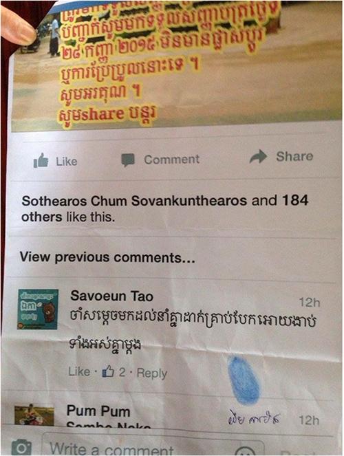 លោកនាយការិយាល័យ បន្ថែមថា និសិត្ស រូបនេះបាន Comment នៅក្នុងទំព័រ Facebook (Savoeun Rao) របស់ខ្លួន ដោយសរសេរថា «ចាំសម្ដេចមកដល់នាំគ្នា ដាក់គ្រាប់បែកឲ្យងាប់ទាំងអស់គ្នាម្ដង»។
