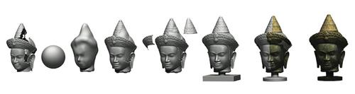 ក្រោយមកទិន្នន័យដែលទទួលបាន ត្រូវ យក មកសិក្សាបន្តតាមកម្មវិធី Pixologic Zbrush ខណៈ សហការីទាំងអស់ បានប្រើប្រាស់កម្មវិធីផ្លូវការទាំងអស់ ក្នុងការ ចាក់បំពេញចំនុចខ្វះខាត ទៅលើ ព្រះកេសស្តេចខ្មែរ ដែលរងនូវការខូចខាត រហូត ឈាន ដល់ សម្រេចបាន ផលិតស្នាដៃ សិល្បៈថ្មី ពេញលេញ ល្អស្អាត អនុលោម ទៅតាម រូបភាពដើម ។ តាមការ គូសបញ្ជាក់ជាក់ស្តែង ពីលោក Lemaresquier អោយដឹងថា ដើម្បី ធានា អោយបាន ការសម្រេចបាននូវ ស្នាដៃសិល្បៈជារូបភាព ជាក់ស្តែង ជាគំរូ 3D ក្រុមការងារបស់លោក បានប្រើប្រាស់ បច្ចេកវិទ្យា បោះពុម្ព 3D ដ៏ទំនើបជាទី បំផុតនោះគឺ Mcor IRIS SDL paper-based 3D printer ឈានដល់ទៅការបង្កើត ពណ៌ដូចទៅនឹង សភាពដើម ។