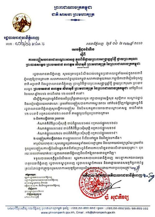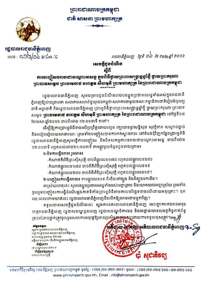(ភ្នំពេញ)៖ រដ្ឋបាលរាជធានីភ្នំពេញ នៅថ្ងៃទី៦ ខែមេសានេះ បានចេញសេចក្តីជូនដំណឹងមួយ ដោយបញ្ជាក់ពីការបញ្ចៀសចរាចរជាបណ្តោះអាសន្ន ក្នុងពិធីថ្វាយព្រះពរសង្ក្រាន្តឆ្នាំថ្មី ថ្វាយព្រះករុណា ព្រះបាទសម្តេច ព្រះបរមនាថ នរោត្តម សីហមុនី ព្រះមហាក្សត្រ នៃកម្ពុជា ដែលប្រារព្ធឡើងនៅថ្ងៃទី៧ ខែមេសា ឆ្នាំ២០១៦ស្អែកនេះ។