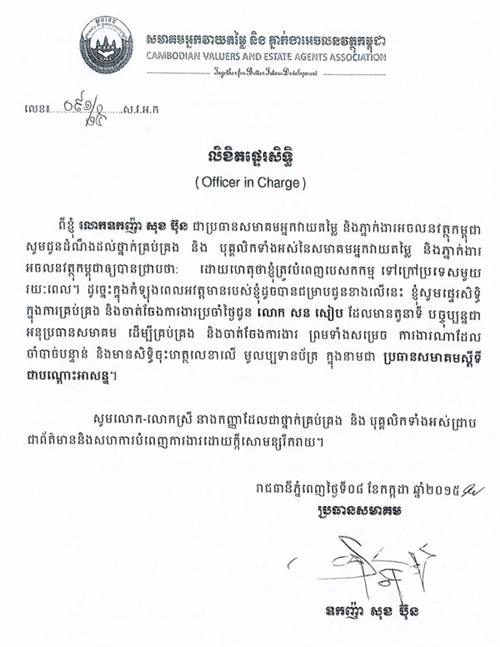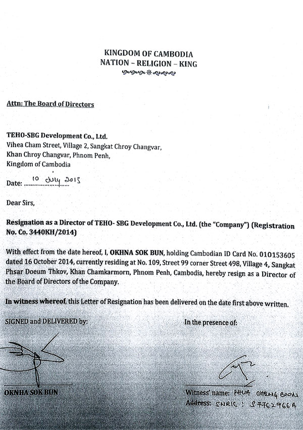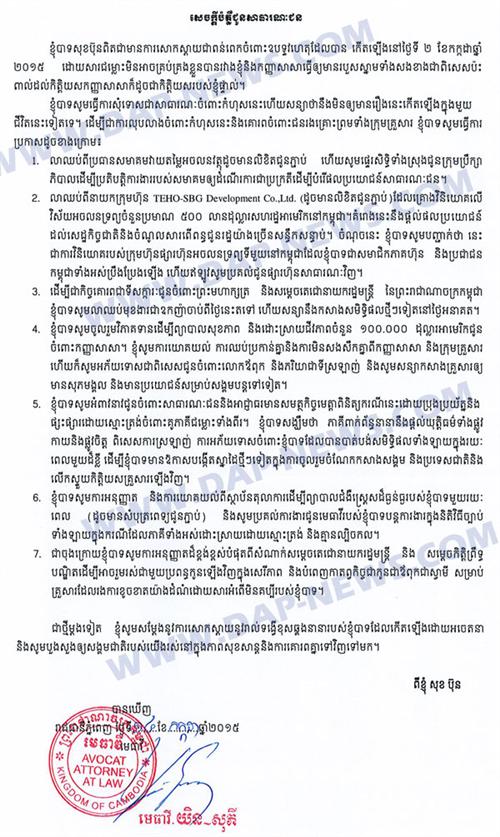 នៅក្នុងលិខិតរបស់លោកសុខ ប៊ុន ក៏ បានបញ្ជាក់ដែរថា លោកក៏បានសុំលាលែងពី តំណែងប្រធានសមាគម វាយតម្លៃ អចលនវត្ថុផងដែរ ព្រមទាំងសុំទោសជាសាធារណៈ ចំពោះកំហុសនេះ ។ លោកសុខ ប៊ុន បានបញ្ជាក់ថា “ខ្ញុំបាទ សុំធ្វើការសុំទោសជាសាធារណៈ ចំពោះកំហុសនេះ ហើយសន្យាថា នឹងមិនឱ្យមានរឿងនេះកើតឡើងក្នុងមួយជីវិតនេះទៀតទេ ” ។