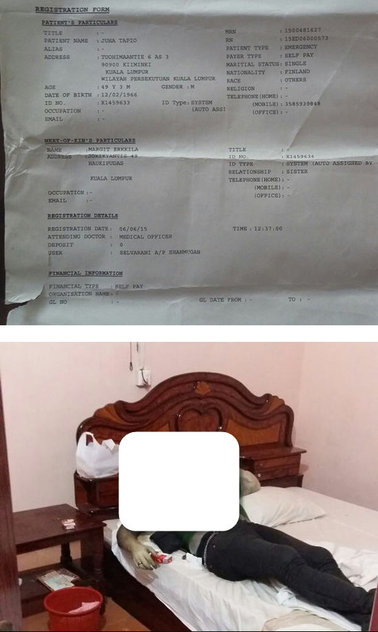នគរបាលមូលដ្ឋានបានឲ្យដឹងថា ជនបរទេសខាងលើមានឈ្មោះJUHA TAPI O ភេទប្រុស ជនជាតិ FINLAND អាយុ 49 ឆ្នាំ មុខរបរជំនួយការិយាល័យ ស្នាក់នៅផ្ទះលេខ73 ផ្លូវលេខ172សង្កាត់ជ័យ ជំនះ ខណ្ឌដូនពេញ។