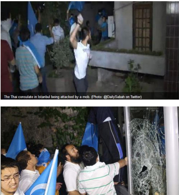 របាយការណ៍ បញ្ជាក់អោយដឹងថា ស្ថានទូតថៃ នៅក្នុងទីក្រុង Ankara និងស្ថានកុងស៊ូល នៅក្នុង ទីក្រុង Istanbul ត្រូវបិទទ្វារជាបណ្តោះអាសន្ន បន្ទាប់ពីស្ថានកុងស៊ូល ត្រូវ បានក្រុមបាតុករ ទួរគី គាំទ្រ Uighur វាយប្រហារកម្ទេចខូចខាតយ៉ាងដំណំ អំឡុងថ្ងៃព្រហស្បត្តិ៍ កន្លងទៅនេះ ។ អង្គការ ឃ្លាំមើលសិទ្ធមនុស្ស បានធ្វើការរិះគន់ ពាក់ព័ន្ធនឹងការធ្វើបត្យាប័ន ជនជាតិដើម ភាគតិច ម៉ូស្លឹម Uighurs ដោយលើកឡើងថា ក្រុមជនជាតិភាគតិចមួយក្រុមនេះ ប្រឈមមុខនឹងការធ្វើទុក្ខទោស នៅក្នុងប្រទេសចិន ។ ទោះជាយ៉ាងណាក៏ដោយចុះ ចិនបដិសេធទៅនឹង ការលើកឡើង ពីការធ្វើ ទុក្ខទោសដល់ជនជាតិ Uighurs ខណៈហៅក្រុមជនជាតិនេះថា ជា ក្រុមជន អន្តោប្រវេសន៍ខុស ច្បាប់ ។