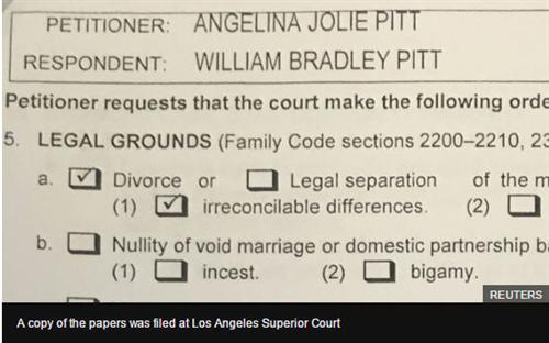 ដោយឡែកបើយោងតាម TMZ reports នៅក្នុងពាក្យបណ្ដឹងសុំលែងលះនាង Angelina Jolie ក៏បានរៀបរាប់ផងដែរ ពីការរស់នៅមិនចុះសម្រុងគ្នា ជាមួយនឹងស្វាមី ព្រមទំាងមិនបានស្នើថែរក្សាកូន៦នាក់ ជារូបវ័ន្តបុគ្គលនោះទេ ក៏ប៉ុន្តែត្រូវមើលថែរួមគ្នាដោយស្របច្បាប់។ មិនតែប៉ុណ្ណោះ នាងក៏មិនបានទាមទារអាហាររូបត្ថម្ភដែរ ហើយបានបញ្ជាក់ថា កាលបរិច្ឆេទនៃការចែកផ្លូវគ្នា គឺនៅថ្ងៃទី១៥ ខែកញ្ញា ឆ្នាំ២០១៦។
