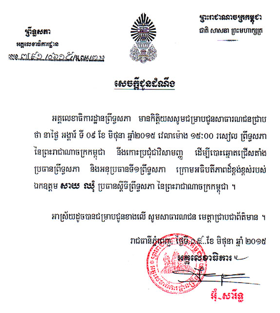 ភ្នំពេញ៖ អគ្គលេខាធិការដ្ឋានព្រឹទ្ធសភា បានប្រកាសថា នៅម៉ោង ៣រសៀលថ្ងៃទី០៩ ខែមិថុនា ឆ្នាំ២០១៥នេះ ព្រឹទ្ធសភា នឹងកោះប្រជុំជាវិសាមញ្ញ ដើម្បីបោះឆ្នោតជ្រើសតាំងប្រធាន និងអនុប្រធានទី១ នៃព្រឹទ្ធសភា។ ពិធី នេះ ប្រារព្ធឡើងក្រោមអធិបតីភាព លោក សាយ ឈុំ ប្រធានស្តីទីព្រឹទ្ធសភា។