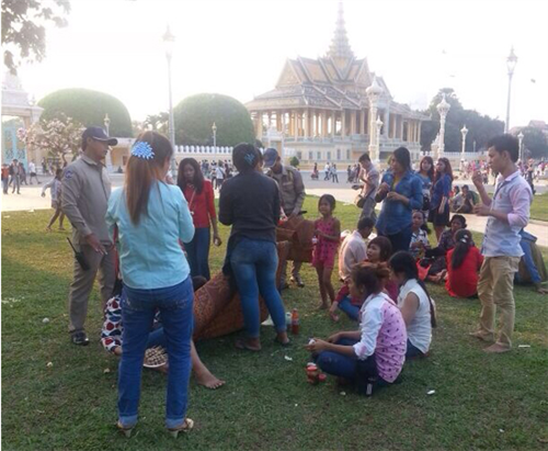 ភ្នំពេញ ៖ ក្រុមសន្ដិសុខ និងប្រជាការពារ ខណ្ឌដូនពេញ ដឹកនាំដោយអភិបាលរងខណ្ឌ លោកឈឹម ឌីណា កាល ពីល្ងាច ថ្ងៃទី១៥ ខែ កុម្ភៈ ឆ្នាំ២០១៥ បានចុះទៅហាមឃាត់សកម្ម ភាពរបស់ប្រជាពលរដ្ឋ ដែលខ្លះបាននាំគ្នា កន្ទេល នៅលើស្មៅ នៅមុខព្រះបរមរាជវាំង ដែលធ្វើឱ្យមានការប៉ះពាល់សណ្ដាប់ធ្នាប់ សាធារណៈ និងសោភ័ណ ភាពនៅទីនោះ ។