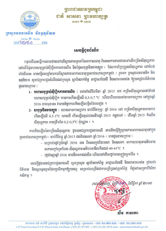 សេចក្តីជូនដំណឹង របស់ក្រសួង ធនធានទឹក និងឧតុនិយម ស្តីពីស្ថានភាពទូទៅ នៃអាកាសធាតុ