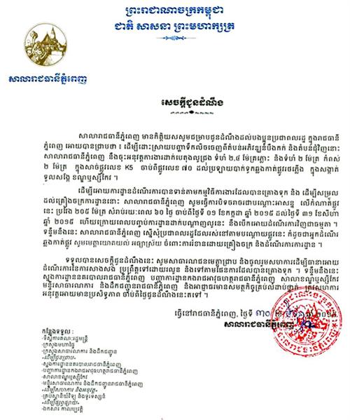 ភ្នំពេញ៖ សាលារាជធានីភ្នំពេញ បានប្រកាសថា ផ្លូវ K5 ចាប់ពីផ្លូវលេខ៧០ ដល់ប្រឡាយបាក់ទូក ឆ្លងកាត់ផ្លូវរថ ភ្លើង ក្នុងសង្កាត់ទួលសង្កែ ខណ្ឌឬស្សីកែវ នឹងត្រូវបិទជាបណ្តោះអាសន្នរយៈពេល ២ខែ ដើម្បីបើកការដ្ឋានដាក់ ប្រព័ន្ធលូទំហំធំ រំដោះទឹកចេញពីតំបន់អភិវឌ្ឍន៍បឹងកក់ និងតំបន់ជុំវិញនោះ។