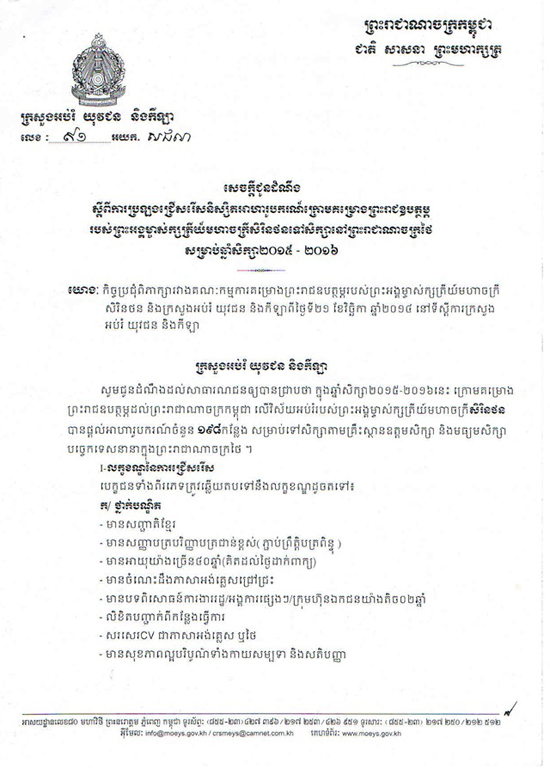 យោងតាមសេចក្តីជូនដំណឹង ដែលចុះហត្ថលេខា ដោយលោក យក់ ង៉ុយ នាយករដ្ឋបាល ក្រសួងអប់រំ យុវជន និងកីឡា នៅថ្ងៃទី២៥ ខែវិច្ឆិកា ឆ្នាំ២០១៤ ដែលមជ្ឈមណ្ឌល ព័ត៌មានដើមអម្ពិល ទទួលបាន នៅថ្ងៃទីចន្ទ ទី១ ខែធ្នូ ឆ្នាំ២០១៤នេះ បានឲ្យដឹងថា ក្នុងការជួយឧបត្ថម្ភដល់កម្ពុជា លើវិស័យអប់រំ ព្រះនាមអង្គម្ចាស់ក្សត្រីយ៍មហាចក្រី សិរិនថន បានផ្តល់អាហារូបករណ៍ ១៩៨កន្លែង សម្រាប់ទៅសិក្សាតាមគ្រឹះស្ថានឧត្តមសិក្សា និងធម្យមសិក្សា បច្ចេកទេសនានា នៅក្នុងប្រទេសថៃ ៕