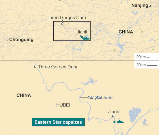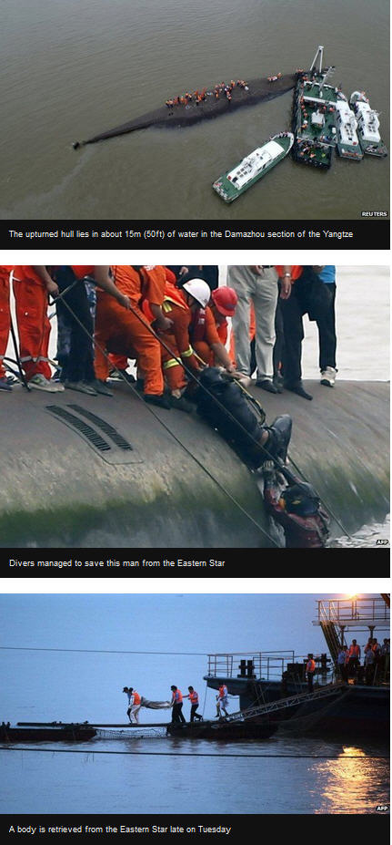 រាប់ពាន់នាក់ នៃក្រុមការងារជួយសង្គ្រោះ បានបំពេញការងារទាំងយប់ ជាមួយនឹងសម្យទាតួនាវាដែល ក្រឡាប់លិចនោះ អណ្តែតមកលើផ្ទៃទឹក នៅក្នុងខេត្ត Hubei ។ របាយការណ៍ បញ្ជាក់ អោយ ដឹងថា ហោចណាស់ មនុស្ស ៧ នាក់ មានសេចក្តីរាយការណ៍ ថាបានស្លាប់បាត់បង់ជីវិត ខណៈ ១៤នាក់ផ្សេង ទៀតត្រូវបានជួយសង្គ្រោះអោយរស់រាន មានជីវិត ពី នាវា Eastern Star ដែលបានផ្ទុកមនុស្សសរុប ៤៥៦ នាក់ ពីជន់លិច ។