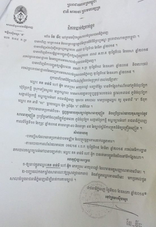 យោងតាមដីការបស់លោកឆាយ វីរៈ ចៅក្រមស៊ើបសួរសាលាដំបូងរាជធានីភ្នំពេញ ចុះថ្ងៃទី២០ ខែឧសភា ឆ្នាំ២០១៥ បានបញ្ជា ឱ្យសមត្ថកិច្ចចាប់ខ្លួនឈ្មោះតត ចាន់ធី ហៅ អ៊ូក អាយុ៣០ឆ្នាំ បច្ចុប្បន្នរស់នៅផ្ទះលេខ ៣៦៩ភូមិចំពុះក្អែក សង្កាត់ព្រែកថ្មី ខណ្ឌ ច្បារអំពៅ ត្រូវបានចោទប្រកាន់ពីបទជួញ ដូរដោយខុសច្បាប់នូវធាតុញៀននិងប្រើ ប្រាស់ដោយខុសច្បាប់នូវសាធាតុញៀន ប្រព្រឹត្ដ នៅចំណុចដីឡូត៍គ្មានលេខ ភូមិចំពុះ ក្អែក កាលពីថ្ងៃទី១១ ខែកុម្ភៈ ឆ្នាំ២០១៥ ។
