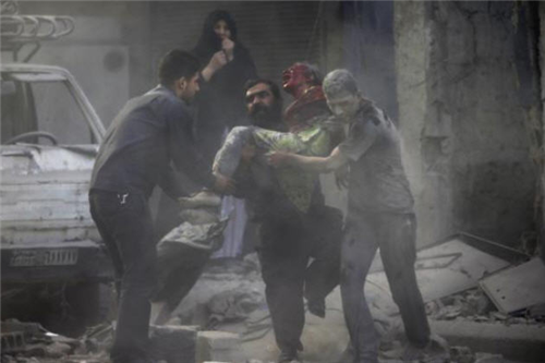 ១១ សីហា ២០១៤ បុរសម្នាក់ កំពុងតែបីជនរងគ្រោះ វ័យ ក្មេង បន្ទាប់ ពី ក្រុមសកម្មជន អះអាង អោយដឹងថា មានការវាយប្រហារ តាមអាកាសដល់ទៅ ៥ លើក ពីសំណាក់កងកម្លាំងស្មោះត្រង់ ទៅ ចំណាត់ការរដ្ឋាភិបាល លោក Bashar al-Assad ភាគខាងកើត al-Ghouta ជិត Damascus ។