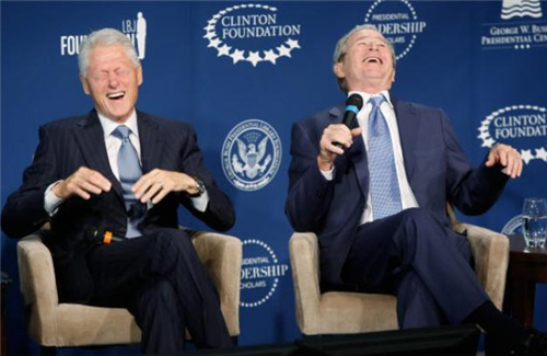 ៨ សីហា ២០១៤ អតីតប្រធានាធិបតី សហរដ្ឋអាមេរិក លោក Bill Clinton និង George W. Bush បានសើច នៅលើវេទិកានៃឆាកកម្មវិធី Presidential Leadership Scholars នៅឯ Newseum រដ្ឋធានី វ៉ាស៊ិនតោន សហរដ្ឋអាមេរិក ។