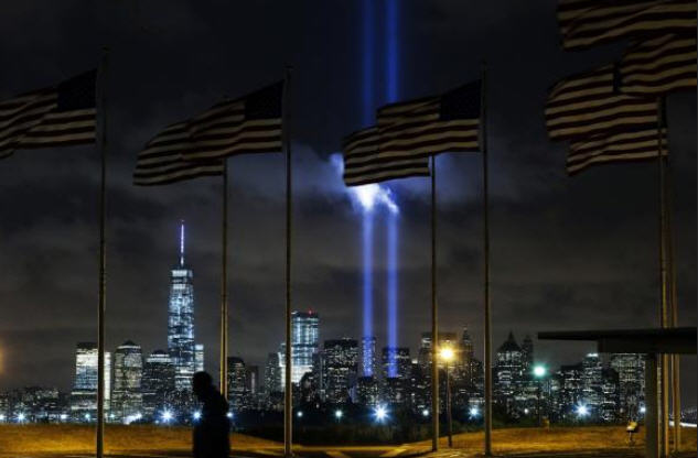 ១០ សីហា ២០១៤ បុរសម្នាក់ បានដើរឆ្លងកាត់ ពន្លឺភ្លើង Tribute in Light ដែល ត្រូវបានគេដាក់តាំង បង្ហាញឡើង ដោយបាញ់ចេញពី ower Manhattan ក្នុងអំឡុងខួបលើកទី ១៣ ឆ្នាំ នៃការវាយប្រហារ ភារវកម្មដ៏អាក្រក់បំផុត ទៅលើសំណង់អាគារភ្លោះ ពាណិជ្ជកម្ម ក្រុង ញ៉ូវយ៉ក កាលពី ឆ្នាំ ២០០១ "13th anniversary of the 9/11 attacks on the World Trade Center in New York" ។