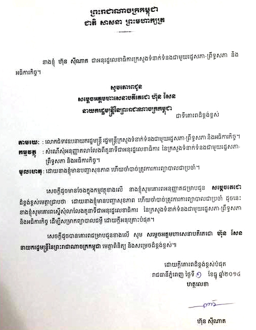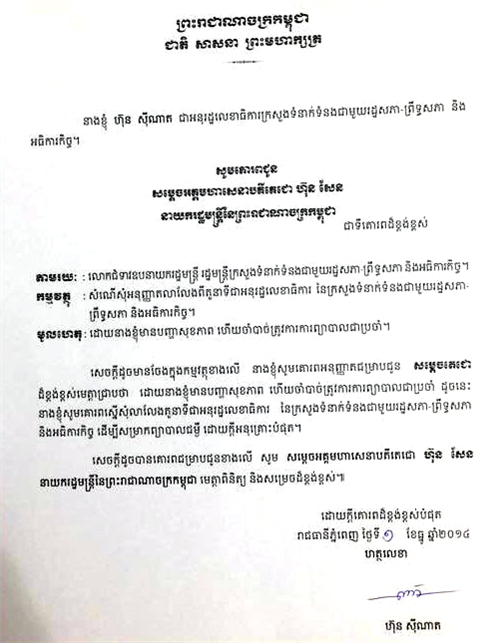 (ភ្នំពេញ)៖ យោងតាមលិខិតមួយសន្លឹក ដែលអង្គភាពព័ត៌មាន FRESH NEWS ទើបទទួលបាននៅមុននេះបន្តិច បានឲ្យដឹងថា លោកស្រី ហ៊ុន ស៊ីណាត អនុរដ្ឋលេខាធិការ ក្រសួងទំនាក់ទំនងជាមួយ រដ្ឋសភា-ព្រឹទ្ធសភា បានដាក់លិខិតជាផ្លូវការ ជូនសម្តេចតេជោ ហ៊ុន សែន ជាបងប្រុសបង្កើតរបស់លោកស្រី។ លិខិតលាលែងនោះ បានបញ្ជាក់ពីមូលហេតុថា ដោយសារលោកស្រីមានបញ្ហាសុខភាព ហើយត្រូវការការព្យាបាលជាចាំបាច់។ សូមជំរាបថា កាលពីថ្ងៃទី២៧ ខែវិច្ឆិកា លោកស្រីបានសរសេរលើ Facebook ថា លោកស្រីមិនអាចដោះស្រាយ ទំនាស់ដីធ្លីជូនប្រជាពលរដ្ឋ ខេត្តកំពង់ស្ពឺ ដោយសាររងឥទ្ធិពលសម្ពាធ និងការប្រមាថពីឧកញ៉ា លី យ៉ុងផាត់ ដូច្នេះលោកស្រីសុំឈប់ការងារពីក្រសួង៕