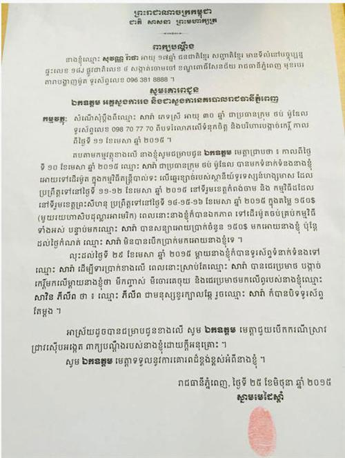 ភ្នំពេញ៖ បន្ទាប់ពីផ្ទុះជម្លោះ យ៉ាងស្រួចស្រាល រវាងតារាសម្តែងជើងថ្មី កញ្ញា សុវណ្ណ រ៉ាផា និងប្រធានក្រុមបង្ហាញម៉ូដ Pop Model កញ្ញា សារ៉ា ជុំវិញការជំពាក់លុយថ្លៃបង្ហាញម៉ូដ ចំនួន១៥០ដុល្លារ កាលពីថ្ងៃទី១២ ខែមេសា ឆ្នាំ២០១៥ រួចមករហូតមកដល់ពេលនេះ កញ្ញា សុវណ្ណ រ៉ាផា បានសម្រេចចិត្ត ដាក់ពាក្យបណ្តឹងជាផ្លូវការ ទៅកាន់លោកស្នងការ នគរបាល រាជធានីភ្នំពេញ ដើម្បីចាត់វិធានការ ទៅតាមផ្លូវច្បាប់ ចំពោះតារាម៉ូដែលរូបនេះ ពីបទក្បត់សេចក្ដីទុកចិត្ត និងបរិហារកេរ្តិ៍ ។