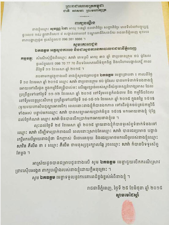 ក្នុងពាក្យបណ្តឹងដែលមានស្នាមមេដៃ របស់កញ្ញា រ៉ាផា ចុះថ្ងៃទី២៥ ខែមិថុនា ឆ្នាំ២០១៥នេះបានឲ្យដឹងថា «កាលពីថ្ងៃទី ១០ ខែមេសា ឈ្មោះសារ៉ា ជាប្រធានក្រុម Pop Model បានទំនាក់ទំនងនាងខ្ញុំឲ្យទៅដើរម៉ូដ ក្នុងកម្មវិធីបាល់ទះលើឆ្នេរខ្សាច់ របស់ស្ថានីយទូរទស្សន៍ ហង្សមាស ដែលប្រព្រឹត្តទៅនៅ ថ្ងៃទី១១ និង១២ ខែមេសា ឆ្នាំ២០១៥ ក្នុងខេត្តកំពង់ចាម និងកម្មវិធីដដែលនេះ នៅខេត្តព្រះសីហនុ ដែលបានប្រព្រឹត្តទៅ នៅថ្ងៃទី១៤-១៦ ខែមេសា ក្នុងតម្លៃ១៥០ដុល្លារ »។