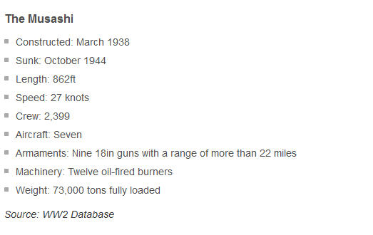 គួរបញ្ជាក់នាវាចម្បាំង យក្ស The Musashiនៅមាននាវាបងប្អូនមួយគ្រឿងទៀតមានឈ្មោះថានាវាយក្ស The Yamato នាវាទាំងពីរគ្រឿងនេះ ជានាវាចម្បាំងយក្សធំបំផុត ដែលត្រូវបានគេស្ថាបនាឡើង ។ សេច ក្តីរាយការណ៍ បញ្ជាក់អោយដឹងថា យន្តហោះចម្បាំង សហរដ្ឋអាមេរិក បានធ្វើការវាយប្រហារពន្លិចនាវា ចម្បាំងយក្ស The Musashi មួយគ្រឿងនេះ កាលពីថ្ងៃទី ២៤ តុលា ឆ្នាំ ១៩៤៤ អំឡុងពេលដែលមាន សង្គ្រាមក្តៅ នៅសមរភូមិ ឈូងសមុទ្រ Leyte ដែលត្រូវបានគេជឿថា ជា ការប៉ះទង្គិច ខាងកងទ័ពជើង ទឹកធំបំផុតនៅក្នុងសម័យសង្គ្រាមលោកលើកទី ២ នៅពេលដែល អាមេរិក និង កងកម្លាំងអូស្ត្រាលីផ្តួល ជប៉ុន ។