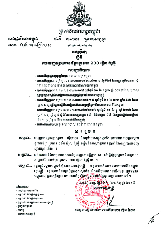 ភ្នំពេញ ៖ រាជរដ្ឋាភិបាកម្ពុជា បានចេញនូវ អនុក្រឹត្យចំនួន២ ដោយសម្រេចដាក់ ឲ្យចរាចរណ៍ក្រដាក់ប្រាក់ ៥០០រៀល និង១០០រៀលគំរូថ្មី ចាប់ពីថ្ងៃទី១៤ ខែមករា ឆ្នាំ២០១៥ នេះតទៅ ។