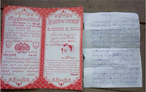 នេះបើយោងតាមសំបុត្រមួយសន្លឹក ដែលភាគីកូនក្រមុំបានសរសេរទុក មុននឹងដាច់ចិត្តចងកសម្លាប់ខ្លួន ដែលខ្លឹម សារនៅក្នុងសំបុត្រនោះ មានអត្ថន័យថា « ប៉ា ម៉ាក់ ឲ្យកូនសុំទោស ព្រោះពេលនេះពិបាកទ្រាំណាស់ កូនដឹងថាកូន ខុស តែឲ្យនៅរស់មួយថ្ងៃ តែងនឹកប្តីកូនមួយថ្ងៃ នឹកពាក្យសំដី នឹកអ្វីៗដែលសាងរួមគ្នា ពេលខ្លះកូនមិនចង់គិតទេ តែ ឲ្យតែកូនបិទភ្នែក កូនតែងតែនឹកឃើញទាំងអស់ កូនមិនអាចទទួលយកការពិតមួយនេះបានទេ ។ ពួកកូនបានសន្យា ជាមួយគ្នាហើយ បើរស់ត្រូវរស់ជាមួយគ្នា បើស្លាប់ត្រូវទៅជាមួយគ្នា ពេលនេះកូនមិនអាចធ្វើចិត្តបាន ហើយក៏មិនអាច រស់ក្រោមស្រមោលមួយនេះ ព្រោះវាឈឺចាប់ណាស់ចំពោះកូន ហេតុអ្វីបានវាសនាបំបែកពួកកូន កូនស្រលាញ់គ្នា ណាស់ ពួកកូនមិនដែលធ្វើអ្វីខុស ហេតុអ្វីបានជាបែកគ្នា បែកទាំងមិនបានផ្តាំលា បែកទាំងមិនអស់ចិត្ត » ។