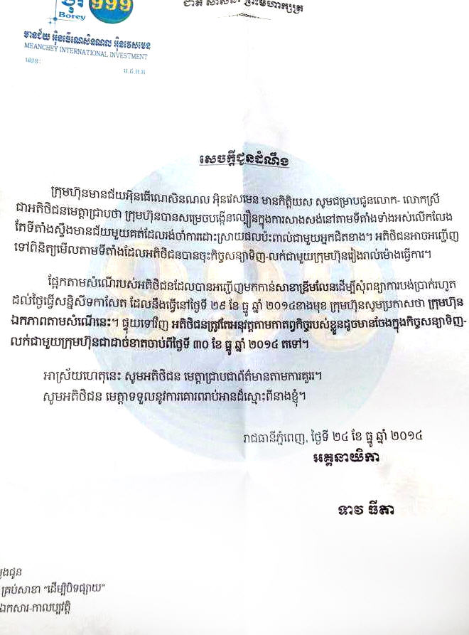 (ភ្នំពេញ)៖ ក្រុមហ៊ុនបុរី៩៩៩ របស់លោក ថោង សារ៉ាត់ បានប្រកាសបង្កើនល្បឿន ការសាងសង់បុរីរបស់ខ្លួនបន្ថែមទៀត តាមកិច្ចសន្យាចាប់ពីថ្ងៃទី៣០ ខែធ្នូ ឆ្នាំ២០១៤ តទៅ នេះបើតាមការប្រកាសរបស់ ក្រុមហ៊ុនមានជ័យ អ៉ីនធើណេសិនណល អ៉ីនវេសមេន នៅថ្ងៃទី២៤ ខែធ្នូ ឆ្នាំ២០១៤នេះ ។ ការប្រកាសនេះបានធ្វើឡើង បន្ទាប់ពីមានអតិថិជនជាច្រើន បានសម្តែងការព្រួយបារម្ភខ្លាចក្រែងគម្រោងបុរីនេះ មិនអាចទៅមុខបាន ក្រោយពេលសមត្ថកិច្ចតាមចាប់លោក ថោង សារ៉ាត់ ជាម្ចាស់ក្រុមហ៊ុននេះ ដែលកំពុងរត់គេចខ្លួន។ សូមបញ្ជាក់ថា ក្នុងសេចក្តីប្រកាសនោះបង្ហាញថា អ្នកស្រី ទាវ ធីតា ជាអគ្គនាយិកា និងគ្រប់គ្រងក្រុមហ៊ុនបុរី ៩៩៩ ដែលគេដឹងថា ជាភរិយាទី២ របស់ថោង សារ៉ាត់៕