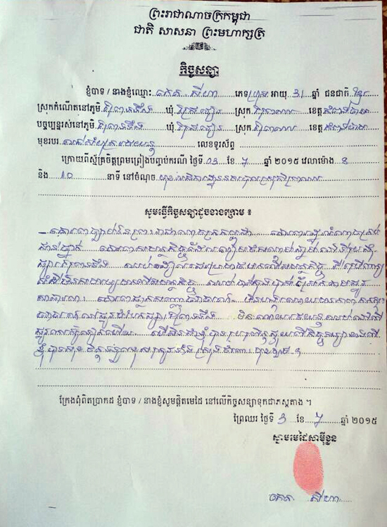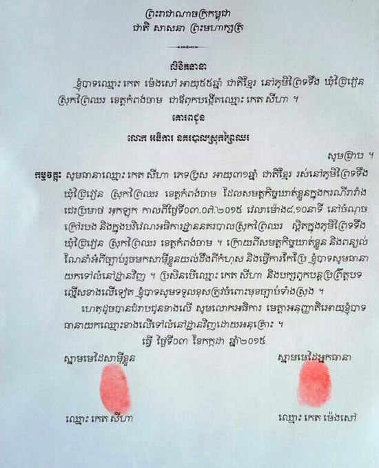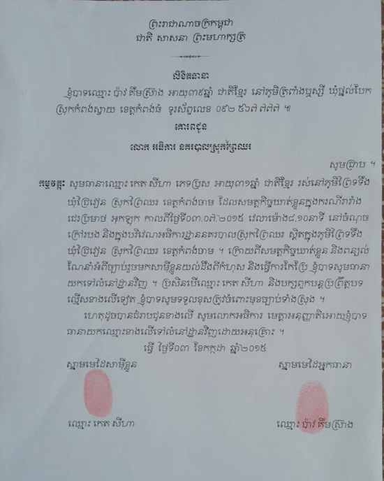 កំពង់ចាម : ទីបំផុត ក្រុមគ្រួសារ ដែលរកស៊ីលក់សំបុត្ររថយន្ត ក្រុងស្ថិត នៅផ្សារព្រទទឹង ភូមិព្រៃទទឹង ឃុំជ្រៃវៀន ស្រុកព្រៃឈរ ខេត្តកំពង់ចាម បានទទួលស្គាល់កំហុស និងបានធ្វើកិច្ចសន្យា សុំទោសជាផ្លូវការ ចំពោះអធិការនគរបាលស្រុកព្រៃឈរ ព្រមទាំងសមត្ថកិច្ចចរាចរ ក្រោយពីក្រុមគ្រួសារមួយនេះ បានយក រថយន្តដឹកធុងបាស់ ទៅស្រែកជេរ នៅមុខអធិការដ្ឋាន នគរបាលស្រុក រឿងចាប់ឃាត់រថយន្តក្រុង របស់ពួកគេ មួយគ្រឿង ដែលចតនៅកន្លែងហាមឃាត់ និងកន្លែងផ្លូវបំបែក កាលពីថ្ងៃទី៣ ខែកក្កដា ឆ្នាំ២០១៥។