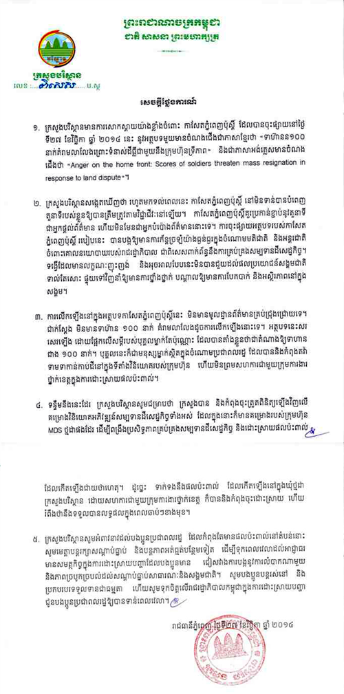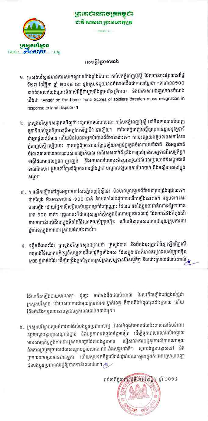 (ភ្នំពេញ)៖ក្រសួងបរិស្ថានបានប្រតិកម្ម ទៅនឹងការចុះផ្សាយរបស់ កាសែតភ្នំពេញប៉ុស្តិ៍ នៅព្រឹក ថ្ងៃទី២៧ ខែវិច្ឆិកា ឆ្នាំ២០១៤នេះ ដែលបានដាក់ចំណងជើងថា «ទាហាន១០០នាក់ គំរាមលាលែង ព្រោះទំនាស់ដីធ្លី ជាមួយនឹងក្រុមហ៊ុនទ្រីភាព»។ ក្រសួងបរិស្ថានបានអះអាងថា ការចុះផ្សាយនេះ មិនពិតនោះទេ ហើយគ្មានទាហាន ១០០នាក់ណា ដែលបានគំរាមលាលែង ពីការងារនោះដែរ។