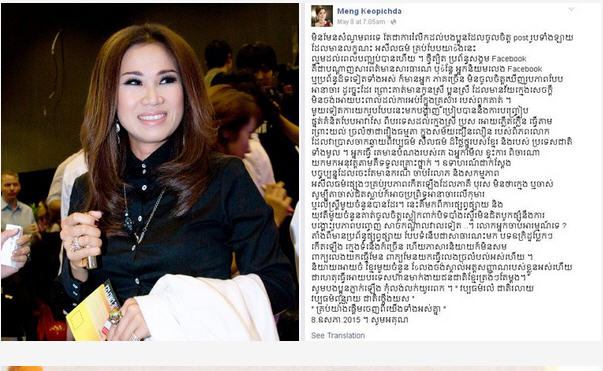 ភ្នំពេញ៖ តារាចម្រៀង មានទឹកដមសំនៀងពីរោះផ្អែមស្រទន់ ដូចរៃកណ្ដឹង មានឈ្មោះល្បីរន្ទឺរាប់ឆ្នាំ អ្នកនាង ម៉េង កែវពេជ្ជតា បានចេញមុខស្នើ ទៅដល់ទស្សនិកជន ក៏ដូចជាអ្នកដែលនិយមលេងបណ្តាញ ទំនាក់ទំនង សង្គមយក្ស Facebook ទាំងអស់ សូមមេត្តាកុំយករូបភាព អាសអាភាសមកបង្ហោះ នៅលើបណ្តាញមួយនេះ ព្រោះថា វាជាទង្វើអសីលធម៌ និងធ្វើឲ្យក្មេងៗ ឃើញរូបភាពបែបនោះ នាំឲ្យមានការភ្លើតភ្លើន។