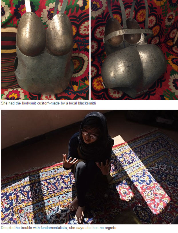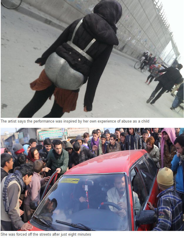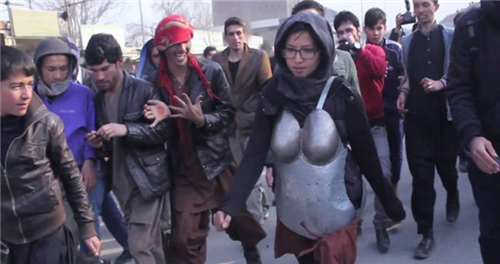 ប៊ីប៊ីស៊ី ចុះផ្សាយអោយដឹងថា វិចិត្រករ ប្រទេស អាហ្វហ្គានីស្ថាន រូបនោះ មានឈ្មោះថា Kubra Khademi បានស្លៀកពាក់ឈុតសម្លៀកបំពាក់ ធ្វើពីដែក រួចដើរសម្តែង នៅ តាមបណ្តោយផ្លូវនៅក្នុងទីក្រុង កាប៊ុល ដើម្បីបង្កើនការយល់ដឹងអោយស្រ្តីភេទ មានការការពារខ្លួនអោយបានខ្ពស់ ពីការចាប់រំលោភ និងបង្កើន ការយល់ដឹង ដល់បណ្តាបុរសអោយសម្លាប់ចិត្ត ចង់រំលោភបំពាន ដោយ កេ ងប្រវ័ញ ផ្លូវភេទទៅលើស្រ្តី និងកុមារ ។